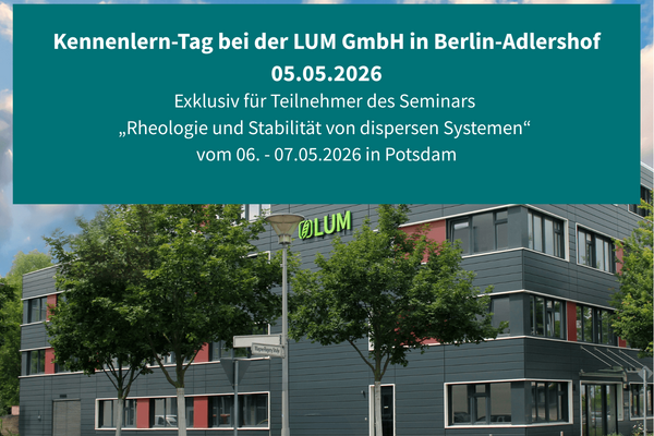 Reisen Sie gerne schon am Dienstag (05.05.2026) an und nutzen Sie den Nachmittag für einen exklusiven Kennenlern-Tag bei der LUM GmbH in Berlin-Adlershof. In entspannter Atmosphäre erhalten Sie einen praxisnahen Einblick in moderne Messtechnik und Stabilitätsanalysen für disperse Systeme – ideal, um sich optimal auf das anschließende Seminar vorzubereiten.